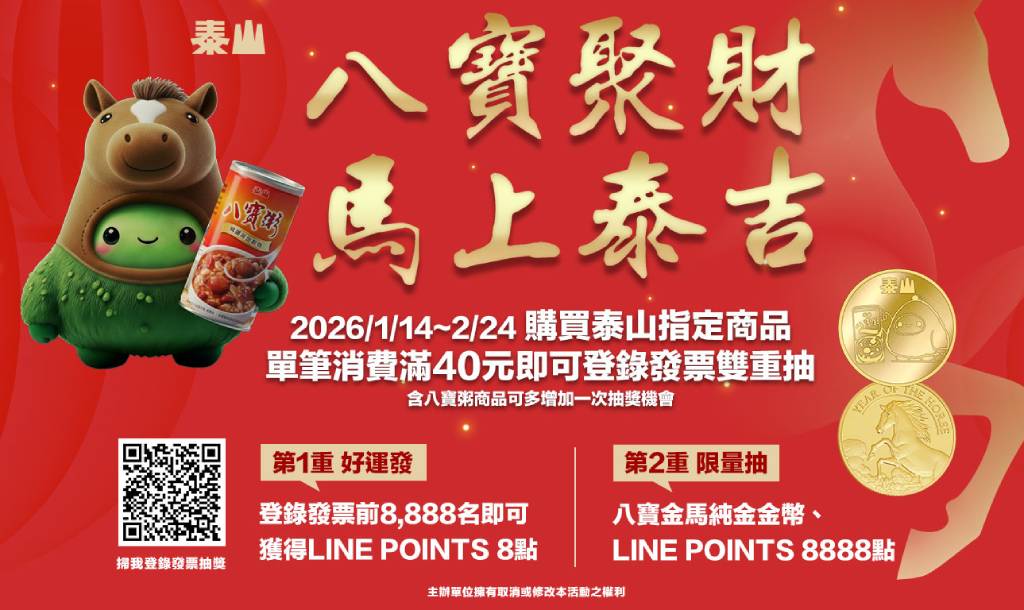 泰山企業指出,為迎接馬年推出「八寶聚財・馬上泰吉」抽獎活動,自即日起至 2 月 24 日,凡消費者購買泰山食品全品項(不含代理品牌與海外品項),單筆滿 40 元並完成發票登錄即可參加抽獎。獎項包含馬年 1.5 錢純金金幣、LINE POINTS 8,888 點與 888 點,以及馬年限定版吉祥物吊飾等,總獎項數超過 9,000 份。此外前 8,888 名完成登錄並通過審核的消費者,還可獲得 LINE POINTS 8 點回饋。今年適逢泰山八寶粥上市 40 週年,活動期間購買八寶粥商品可額外獲得一次抽獎機會,活動詳情可參考官方活動網站。