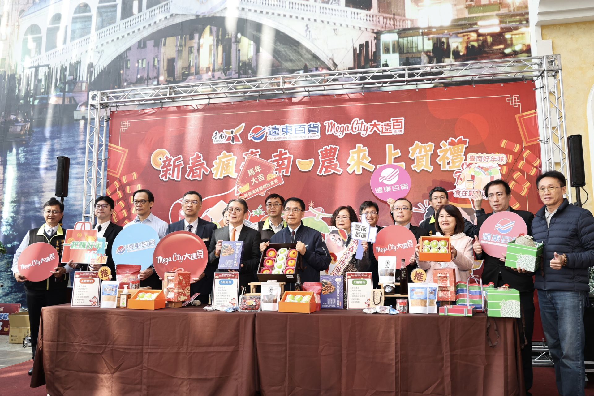 ▲黃偉哲市長與遠東百貨代表及參展業者合影,共同推薦台南農產年節好禮,邀請民眾把握展期採購優質年貨。(新聞處 提供)