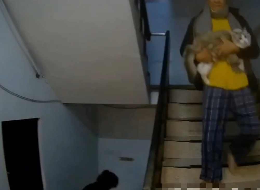 台北市大安區住商大樓火警,住戶抱著寵物貓逃生。翻攝畫面