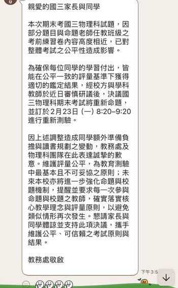 該名家長也貼出教務處的回應,教務處表示本次期末考國三物理科試題,因部分題目與命題老師任教班級之考前練習卷内容高度相近,已對整體考試之公平性造成影響。為確保每位同學的學習付出,皆能在公平一致的評量基準下獲得適切的鑑定結果,經校方與學科教師於近日審慎研議後,決議國三物理科期末考試將重新命題,並訂於2月23日(一)8:20-9:20進行重新測驗。