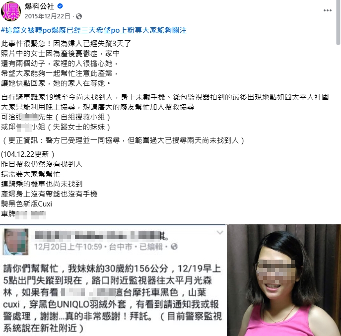 邱女失蹤後家人於臉書社團PO文協尋。翻攝畫面