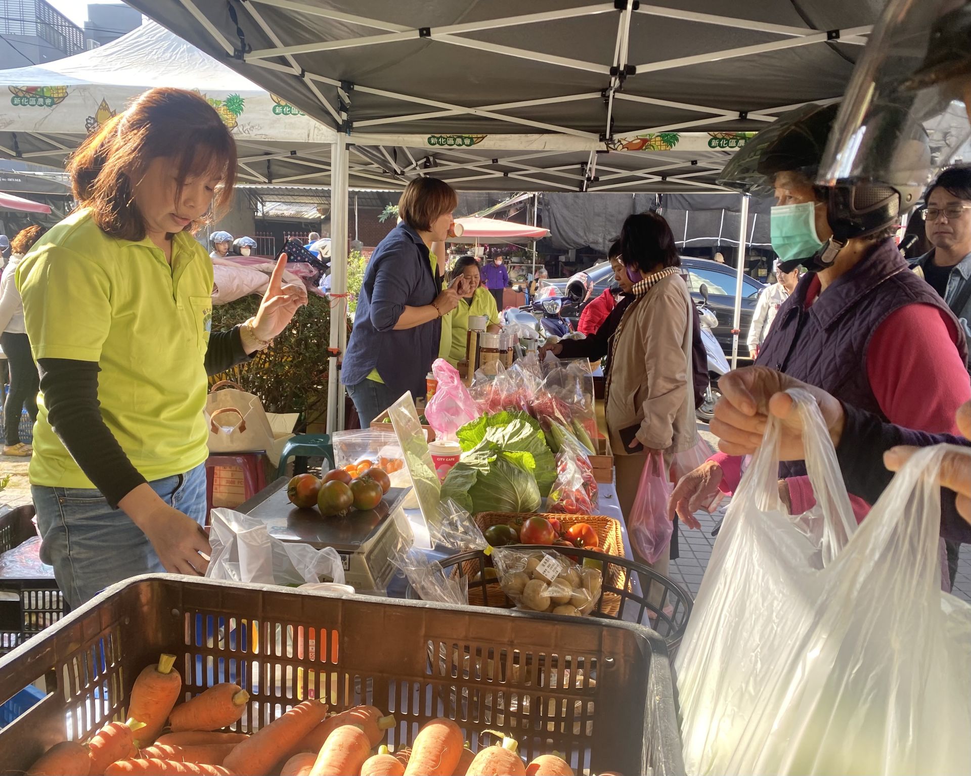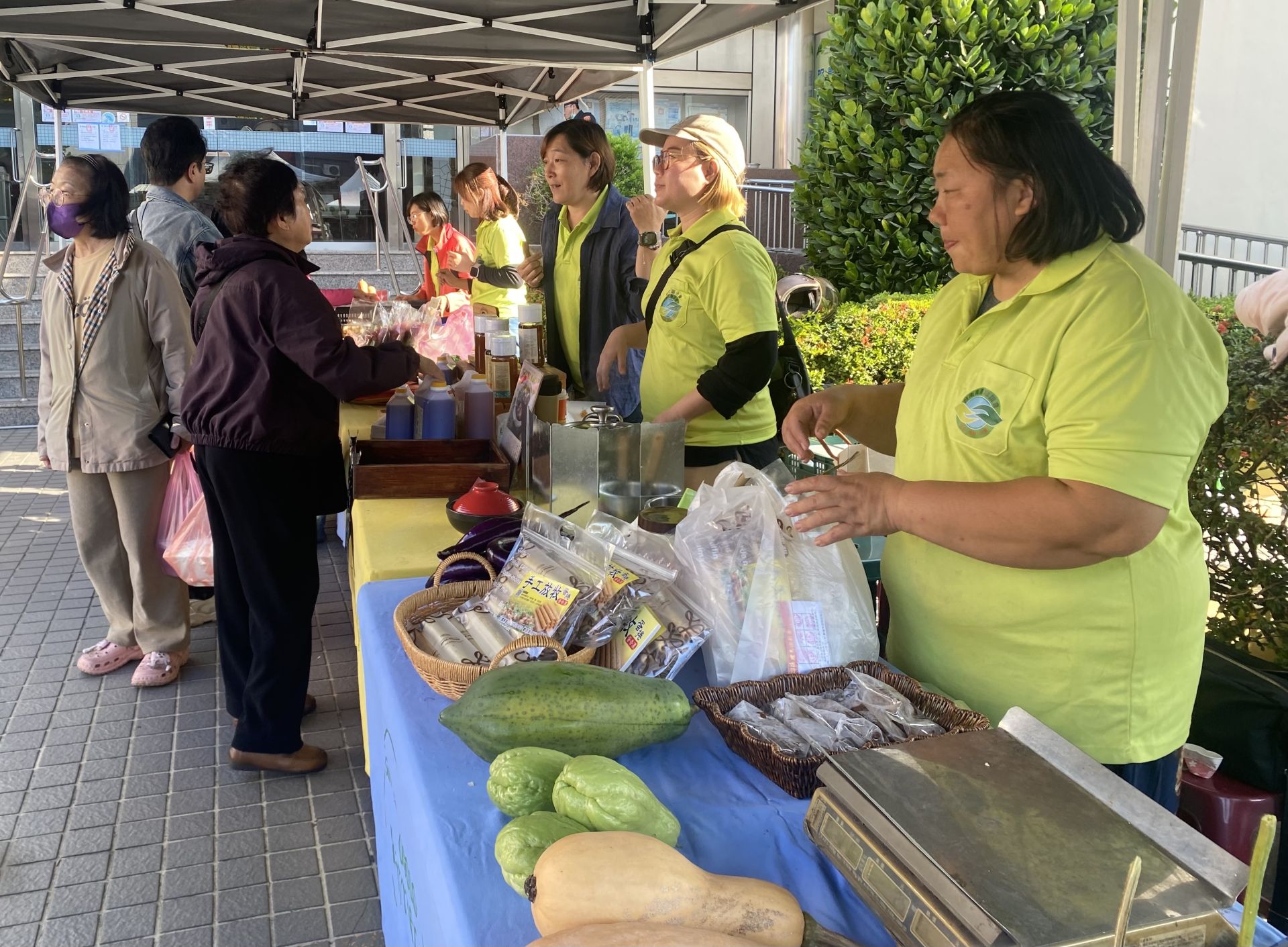 ▲市集現場展售各式農產品,推廣「食當季、享在地」理念,邀請民眾在年節前踴躍選購在地優質農產品。(農業局 提供)
