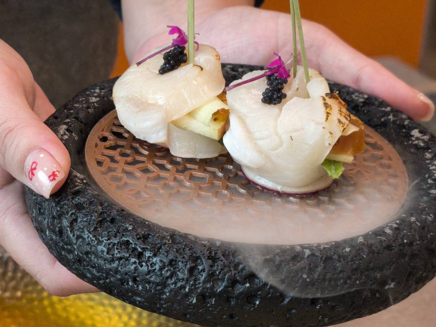 《海港匠鍋》店內主打的「雙人珍饌御膳」套餐,從前菜到甜點層層鋪陳---極品小堡貝、蟹膏茶碗蒸與酥脆牛蒡手卷等各式不同精緻前菜揭開序幕,口感細膩與酥香交錯;刺身拼盤與鮭魚卵山藥細麵展現當日漁獲鮮度,日本生蠔海鮮盤更將「鮮活現流」直接端上桌,成為視覺與味蕾焦點。