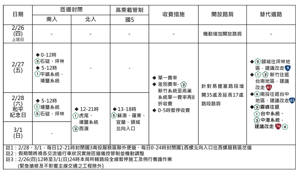 為緩解壅塞,交通部高速公路局與警方祭出相關配套措施,於2月27日至3月1日國道1號北向「頭屋至新竹系統」路肩開放,部分路段將視車流情況,機動增加開放路肩行駛;又於2月28日至3月1日期間每日12至21時,封閉國道3號西濱交流道北上匝道,另苗栗縣轄內國道1、3號各交流道均「未實施」高承載管制。替代道路部分,從北向進入建議由頭份交流道下往三灣方向,沿台3線南下直接進入大湖地區,避開快速道路車潮;若從南向進入建議由三義交流道下,沿苗130線或苗52線銜接台3線進大湖地區。