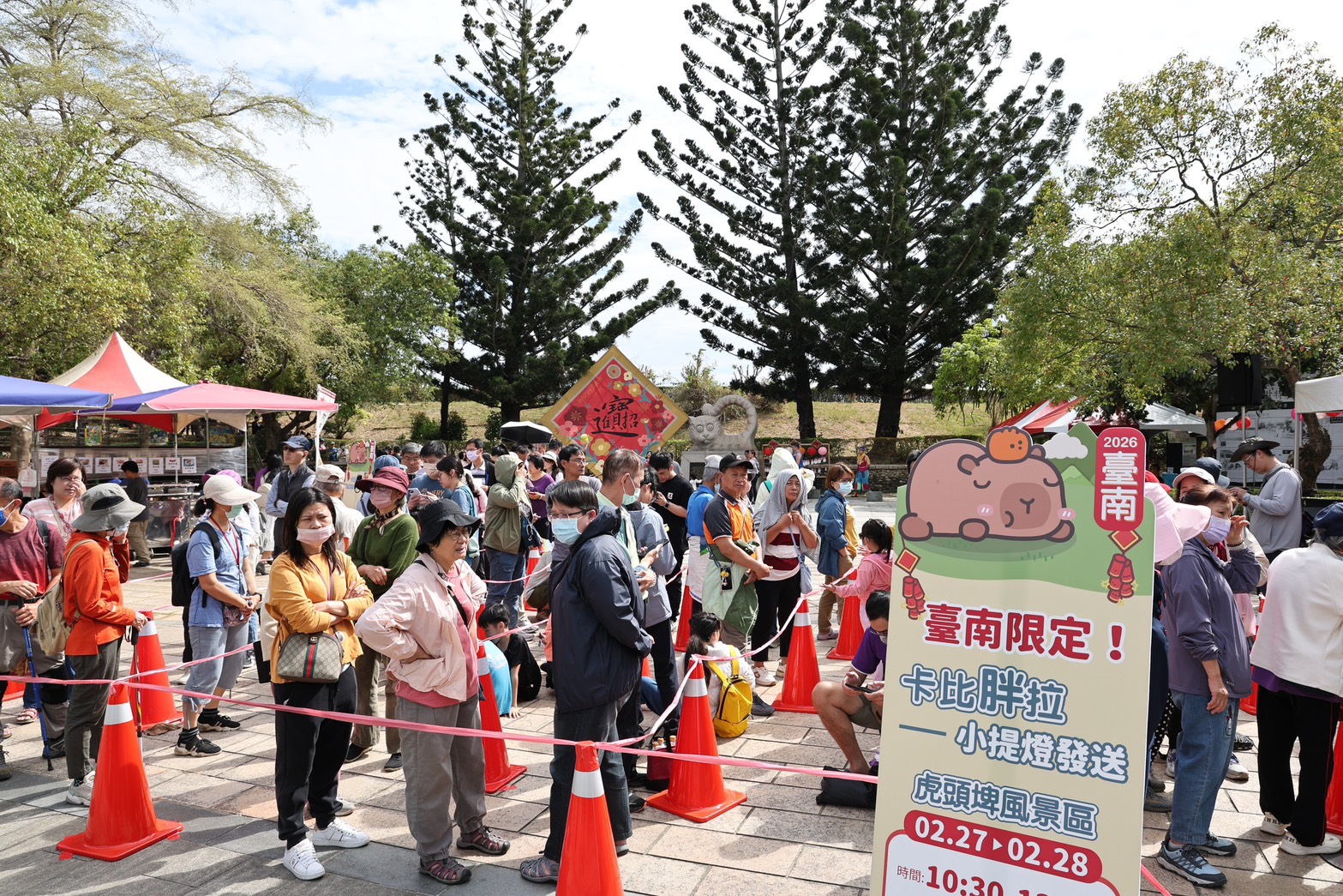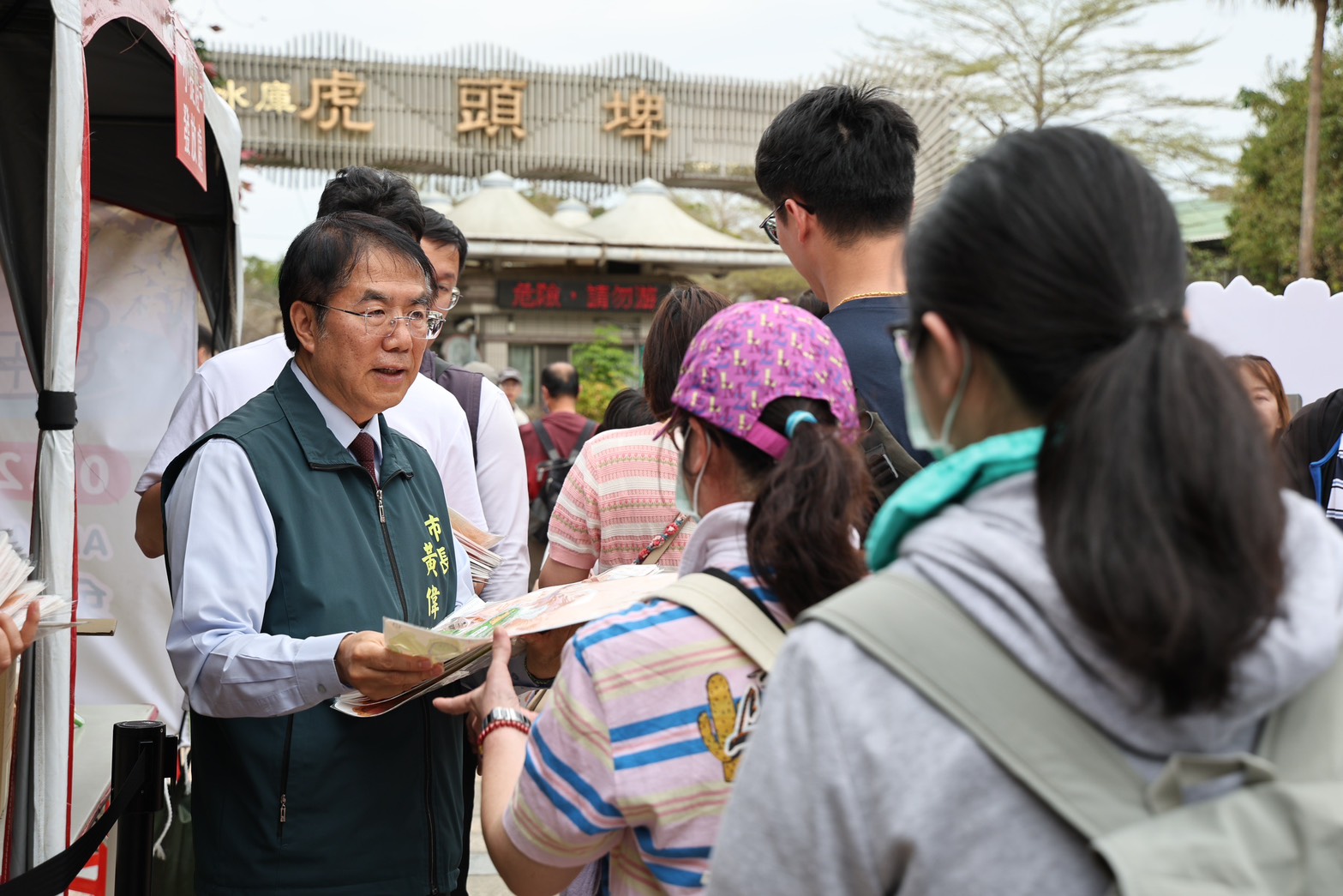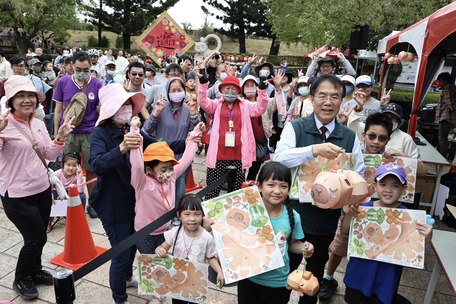 ▲市長黃偉哲今(27)日前往虎頭埤風景區發送限量的卡比胖拉小提燈,現場湧現大批大小朋友排隊領取。(新聞處 提供)