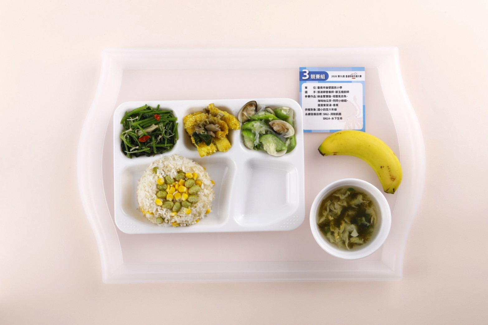 ▲大享食育「第九屆午餐大賽」-後壁國小以綠金雙寶飯、塔醬虱目魚、海味絲瓜煲等料理,傳遞永續漁業理念。(教育局 提供)
