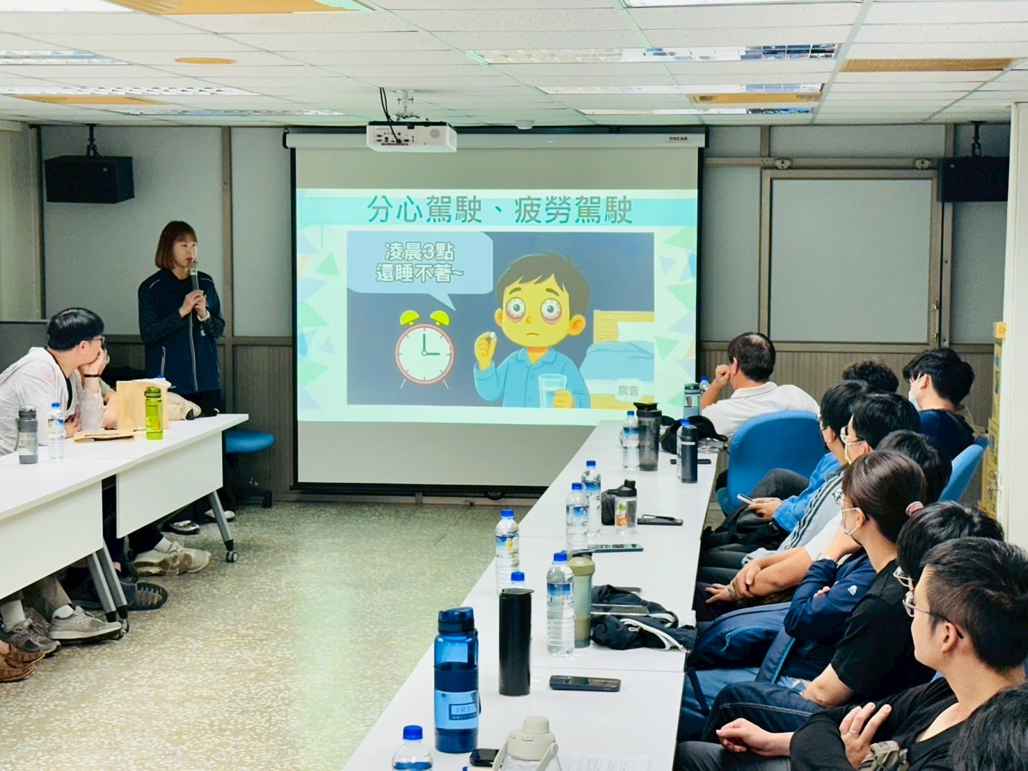 除大型車駕駛外,針對一般職員日常通勤行為,講師亦強調「分心駕駛」及「疲勞駕駛」的潛在風險。行車時若使用手機、操作導航或從事其他分散注意力之行為,將使反應時間明顯延遲;而長時間工作後精神不濟,亦可能出現短暫恍神甚至微睡眠狀況,均大幅提升事故發生機率。講師呼籲駕駛人應專心駕駛、保持良好精神狀態,必要時適時休息,避免因一時分心或疲勞而釀成不可挽回的後果,影響自身及他人生命安全。